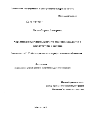 Практическая значимость исследования состоит в том, что разработанная в диссертации методика формирования личностных качеств студентов-вокалистов, подразумевающая, наряду с традиционными методами обучения, специальную работу по учету, развитию, коррекции интеллектуальных, волевых, эмоциональных качеств студентов-вокалистов, способствует максимальному раскрытию вокальных способностей каждого ученика, расширяет спектр профессиональных возможностей будущего специалиста в области вокального искусства. Авторский специальный курс опубликован в качестве учебной программы (М.В. Попова, 2009). По разработанной в процессе исследования методике нами проведены практические и теоретические занятия в вузах культуры и искусств, что подтверждено актами о внедрении. Теоретические выводы и практические рекомендации диссертации нашли отражение в содержании дисциплин «Сольное пение» и «Вокальный ансамбль» Московского государственного университета культуры и искусств и Московского государственного педагогического университета, материалы диссертации используются также при чтении лекций и проведении практических занятий на кафедре психологической адаптации и профессионального развития Государственной классической академии имени Маймонида.
