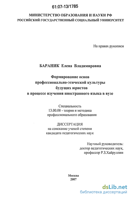 В соответствии с проблемой определена тема диссертационного исследования - «Формирование основ профессионально-этической культуры будущего юриста в процессе изучения иностранного языка в вузе».