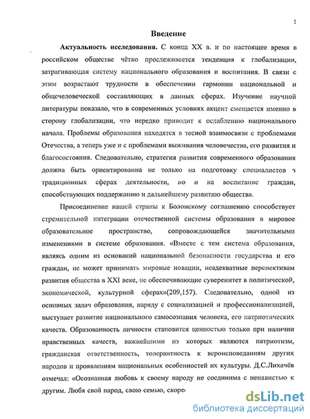 Актуальность исследования. С конца XX в. и по настоящее время в российском обществе прослеживается тенденция к глобализации, затрагивающая систему национального образования и воспитания. Присоединение нашей страны к Болонскому соглашению сопровождается значительными изменениями в системе образования, нередко приводящими к ослаблению национального начала поэтому одной из основных задач образования выступает развитие национального самосознания человека, его патриотических качеств. Образованность личности становится ценностью только при наличии нравственных качеств, важнейшими из юторых являются патриотизм, гражданская ответственность, толерантность к вероисповеданиям других народов и проявлениям национальных особенностей их кульлуры. На этом основании опорой патриотического воспитания личности будущего специалиста должна быть ориентация сознания на национальные ценности и восприятие общечеловеческих.