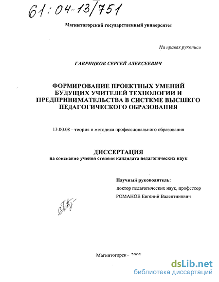 Важность и актуальность проблемы, ее недостаточная теоретическая и практическая разработанность послужили основанием для выбора темы исследования: «Формирование проектных умений будущих учителей технологии и предпринимательства в системе высшего педагогического образования».