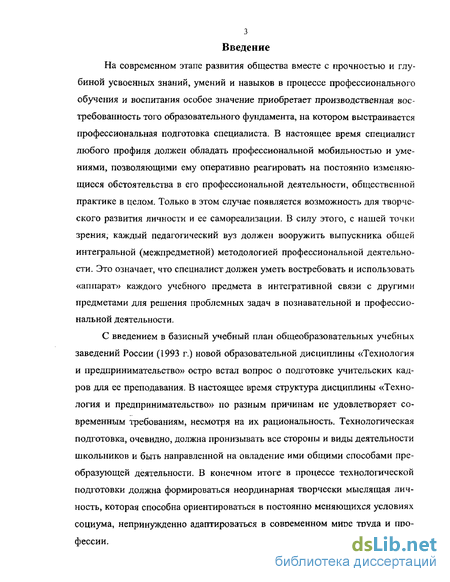 С введением в базисный учебный план общеобразовательных учебных заведений России (1993 г.) новой образовательной дисциплины «Технология и предпринимательство» остро встал вопрос о подготовке учительских кадров для ее преподавания. В настоящее время структура дисциплины «Технология и предпринимательство» по разным причинам не удовлетворяет современным требованиям, несмотря на их рациональность. Технологическая подготовка, очевидно, должна пронизывать все стороны и виды деятельности школьников и быть направленной на овладение ими общими способами преобразующей деятельности. В конечном итоге в процессе технологической подготовки должна формироваться неординарная творчески мыслящая личность, которая способна ориентироваться в постоянно меняющихся условиях социума, непринужденно адаптироваться в современном мире труда и профессии.