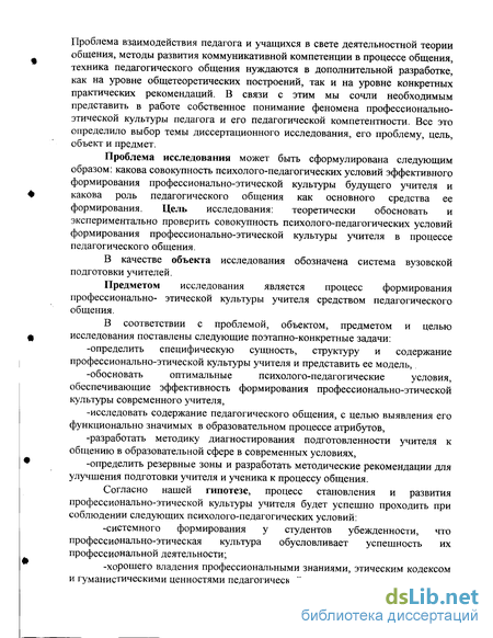 Проблема взаимодействия педагога и учащихся в свете деятельностной теории общения, методы развития коммуникативной компетенции в процессе общения, техника педагогического общения нуждаются в дополнительной разработке, как на уровне общетеоретических построений, так и на уровне конкретных практических рекомендаций. В связи с этим мы сочли необходимым представить в работе собственное понимание феномена профессионально-этической культуры педагога и его педагогической компетентности. Все это определило выбор темы диссертационного исследования, его проблему, цель, объект и предмет.