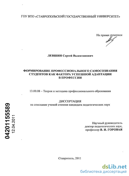 Таким образом, налицо явное противоречие: между потребностью практики высшего профессионального образования в формировании у студентов профессионального самосознания как фактора успешной производственной адаптивности и недостаточной разработанностью этой проблемы в педагогической науке, что и определило тему диссертационного исследования: «Формирование профессионального самосознания студентов как фактора успешной адаптации в профессии». Проблема исследования сформулирована следующим образом: при каких педагогических условиях происходит эффективное развитие профессионального самосознания студентов, которое выступает фактором успешной адаптации личности в профессии?
