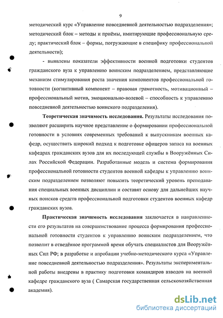 Теоретическая значимость исследования. Результаты исследования позволяют расширить научное представление о формировании профессиональной готовности в условиях современных требований к выпускникам военных кафедр, осуществить широкий подход к подготовке офицеров запаса на военных кафедрах гражданских вузов для их последующей службы в Вооружённых Силах Российской Федерации. Разработанные модель и система формирования профессиональной готовности студентов военной кафедры к управлению воинским подразделением позволяют повысить теоретический уровень преподавания специальных военных дисциплин и составят основу для дальнейших научных поисков средств профессиональной подготовки студентов военных кафедр гражданских вузов.