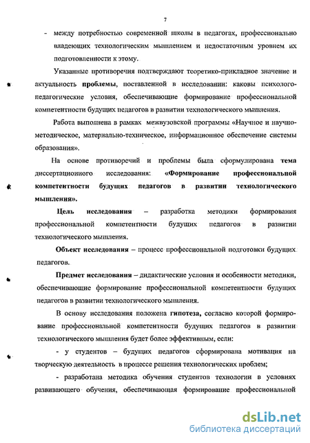 На основе противоречий и проблемы была сформулирована тема диссертационного исследования: «Формирование профессиональной компетентности будущих педагогов в развитии технологического мышления».