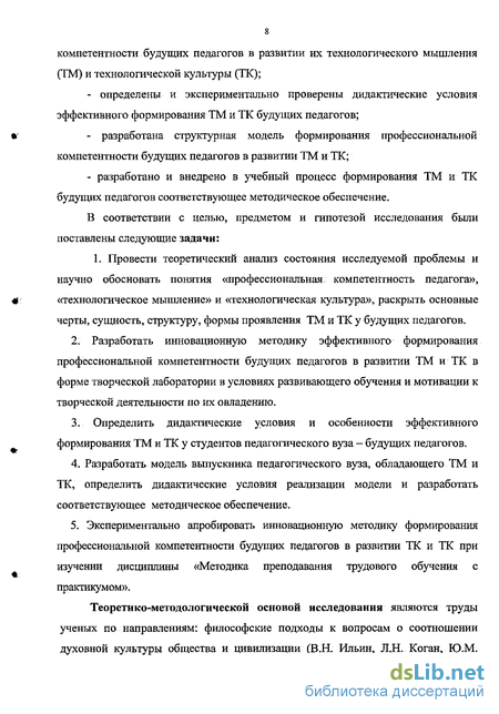 Лотман, Ж. Маритен, Ж.-П. Сартр, И. Хейзинга, О. Шпенглер и др.); вопросы профессиональной подготовки учителя (О.А.Абдуллина, Ю.К. Бабанский, Р. Берне, Н.Ф. Вишнякова, И.Ф. Исаев, А.И. Кочетов, Л.М. Лузина, А.И. Мищенко, Л.С. Подымова, З.И. Равкин, В.А. Сластенин, Е.Н. Шиянов, С.Т.Шацкий и др.); положения о творческой инновационной педагогической деятельности (Ф.Н. Гоноболин, СМ. Годник, З.Д. Жуковская, В.И; Загвязинский, В.А. Кан-Калик, Н.В. Кузьмина, А.К. Маркова, А.Я. Пономарев, В.А. Сластенин, Л.М. Фридман, А.И. Щербаков и др.); теория развивающего обучения (Л.С. Выготский, В.В. Давыдов, В.В. Рубцов, Д.Б. Эльконин и др.); дидактические особенности технологического образования, формирования технологического мышления и технологической культуры (П.Р. Атутов, С.Я. Батышев, О.А. Кожина, И.Я. Лернер, В.П. Овечкин, М.Б. Павлова, В.А. Поляков, В.Д. Симоненко, Ю.Л. Хотунцев и др.).