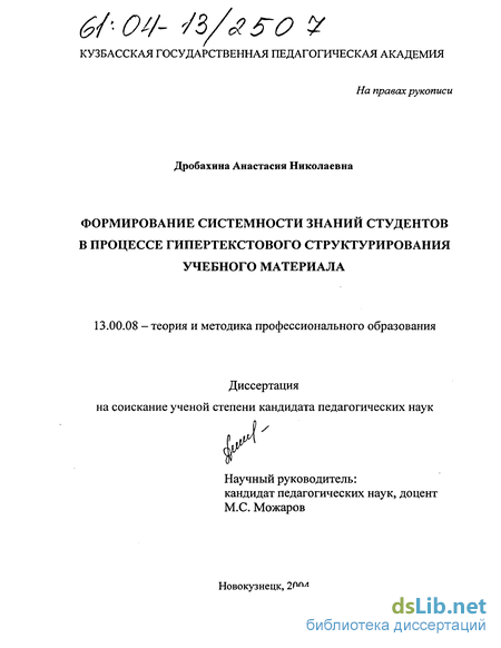 выявлена и обоснована необходимость обучения студентов (в специальном курсе и при изучении конкретных дисциплин) гипертекстовому структурированию учебного материала как средству формирования системности знаний;