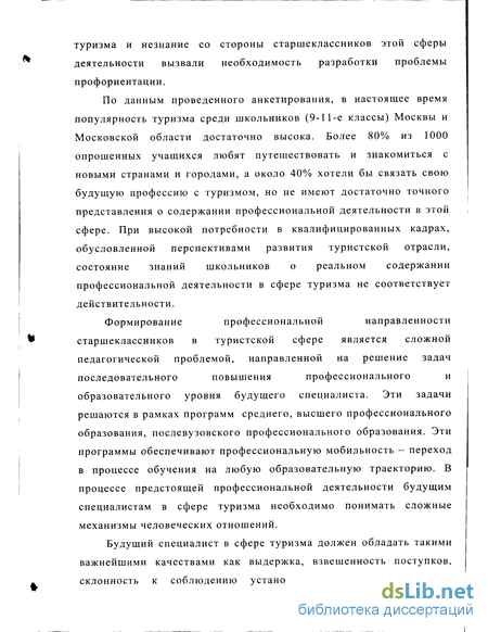 Формирование профессиональной направленности старшеклассников в туристской сфере является сложной педагогической проблемой, направленной на решение задач последовательного повышения профессионального и образовательного уровня будущего специалиста. Эти задачи решаются в рамках программ среднего, высшего профессионального образования, послевузовского профессионального образования. Эти программы обеспечивают профессиональную мобильность - переход в процессе обучения на любую образовательную траекторию. В процессе предстоящей профессиональной деятельности будущим специалистам в сфере туризма необходимо понимать сложные механизмы человеческих отношений.