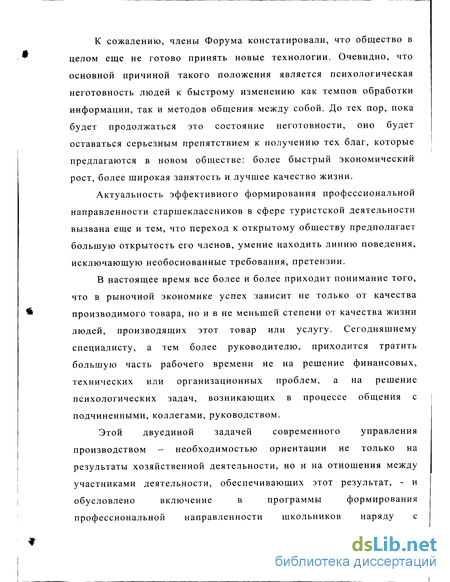 Актуальность эффективного формирования профессиональной направленности старшеклассников в сфере туристской деятельности вызвана еще и тем, что переход к открытому обществу предполагает большую открытость его членов, умение находить линию поведения, исключающую необоснованные требования, претензии.