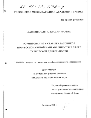 За последние годы появился ряд исследований, посвященных формированию профессиональной направленности личности. Проблема профессионального самоопределения и профессиональной направленности рассматривалась в исследованиях В.В. Абрамовой (1989), А.С. Быкова (2000), Л.Е. Галагановой (1998), Г.А. Гектиной (1994), О.В. Ледневой (1989), Е.С. Мичуриной (1999), Н.В. Пустовалова (1991), И.А. Шарикова (2000), Л.А.Ярославовой (1992) и др. Однако мы не нашли исследований, в которых рассматривается проблема формирования профессиональной направленности старшеклассников в сфере туристской деятельности.