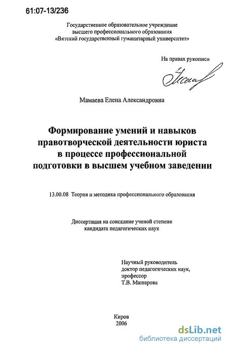 Однако вопрос подготовки юристов к осуществлению правотворческой деятельности в психолого-педагогической литературе остается недостаточно разработанным. Поэтому мы избрали темой нашего исследования проблему формирования умений и навыков правотворческой деятельности юриста в процессе профессиональной подготовки в вузе, что обусловлено: необходимостью повышения качественных параметров подготовки юристов для основных отраслей промышленности, сферы услуг, государственной и муниципальной службы и т. д.; совершенствованием педагогики высшей школы, пополнением ее научного аппарата, содержательных и организационно-методических сторон.