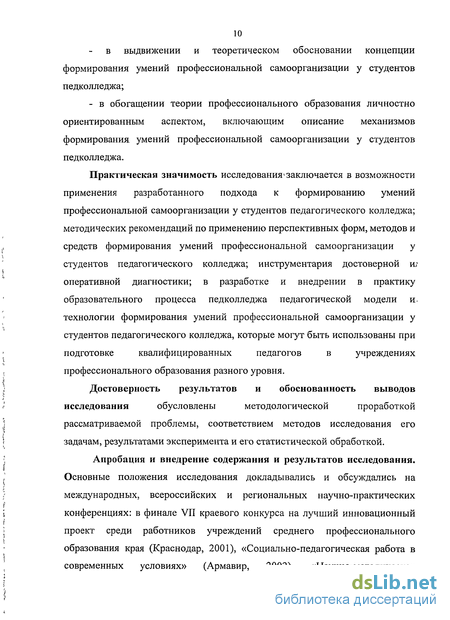10 в выдвижении и теоретическом обосновании концепции формирования умений профессиональной самоорганизации у студентов педколледжа;