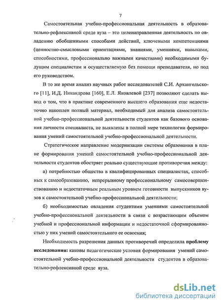 В то же время анализ научных работ исследователей СИ. Архангельского [11], И.Д. Никандрова [160], Е.Л. Яковлевой [237] позволяют сделать вывод о том, что в практике современного высшего образования еще недостаточно накоплен полный материал, необходимый для анализа самостоятельной учебно-профессиональной деятельности студентов как базового основания личности специалиста, не выявлены в полной мере технологии формирования умений самостоятельной учебно-профессиональной деятельности.