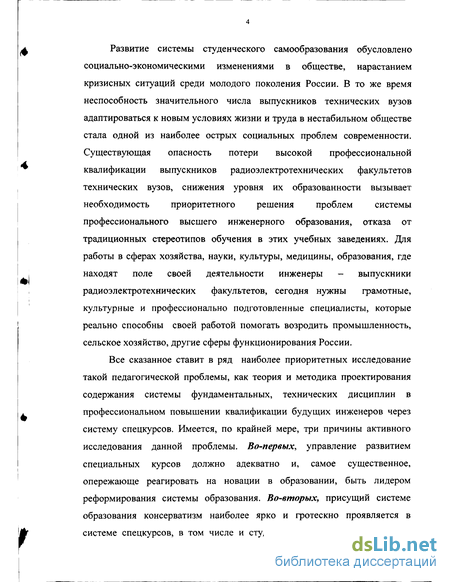 Все сказанное ставит в ряд наиболее приоритетных исследование такой педагогической проблемы, как теория и методика проектирования содержания системы фундаментальных, технических дисциплин в профессиональном повышении квалификации будущих инженеров через систему спецкурсов. Имеется, по крайней мере, три причины активного исследования данной проблемы. Во-первых, управление развитием специальных курсов должно адекватно и, самое существенное, опережающе реагировать на новации в образовании, быть лидером реформирования системы образования. Во-вторых, присущий системе образования консерватизм наиболее ярко и гротескно проявляется в системе спецкурсов, в том числе и студентов радиоэлектротехнических факультетов технических вузов, где поиски новых форм и моделей содержания ведутся, в основном, эмпирически. Поэтому моделирование содержания спецкурсов, в том числе и фундаментальных физико- математических, должно базироваться на научном фундаменте. И, в- третьих, новые задачи системы высшего технического образования, инновационные процессы в нем должны решаться в рамках новой модели проектирования содержания спецкурсов студентов радиоэлектротехнических факультетов технических вузов, сформированной на научных подходах и результатах исследования.