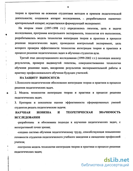 Диссертационная работа посвящена проблеме интеграции теории и практики в педагогической деятельности. Интеграция педагогической науки и практики становится значимой в середине восьмидесятых годов XX века, получает дальнейшее развитие в трудах ученых в течение последних 15-20 лет. Идеи межнаучной, межпредметной интеграции в образовании обусловлены социально-экономическими переменами в жизни современного общества, потребностями в специалистах образования, способных адаптироваться в новых социально-экономических условиях. В нормативных документах "Национальная доктрина образования", "Концепция модернизации российского образования на период до 2010 года" идеи интеграции педагогической теории и практики получают дальнейшее развитие.