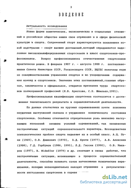 В психологии спорта исследованию деятельности, протекающей в экстремальных условиях (предельные физические и психические напряжения, риск, дефицит времени), придают особое внимание. Такие условия спортивной деятельности создают для человека значительные трудности, эффективное преодоление которых невозможно без волевых усилий, без сознательной мобилизации всех сил, без необходимой регуляции действий и состояния (А.В. Алексеев, 1969; А.Ц. Пуни,1969; О.В. Дашкевич,1970; Л.Д.Гиссен,1973,1990; Е.Д.Кре-ти,1977; Н.А. Хренов,1981; А.В. Родионов,1983; Г.Д. Горбунов,1986, 1995; Е. Nideffer,1979; S.Butt,1987 и др.).