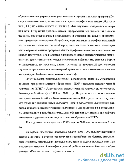 образовательных учреждениях разного типа и уровня и анализ программ Государственного стандарта высшего и среднего профессионального образования (ГОС) по специальности «Дизайн» (0514); изучение материалов всемирной сети Интернет по проблеме новых информационных технологий в жизни человека, профессиональной деятельности и образовании; анализ программных продуктов компьютерной графики, применяемых в профессиональной деятельности специалистов-дизайнеров; методы педагогического моделиро- ь вания образовательных программ общего профессионального и специального