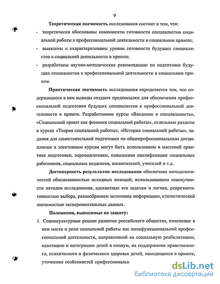 Положения, выносимые на защиту: 1. Социокультурные реалии развития российского общества, изменение в нем места и роли социальной работы как полифункциональной профессиональной деятельности, направленной на социальную реабилитацию, адаптацию и интеграцию детей в социум, на поддержание нравственного, психического и физического здоровья детей, находящихся в приюте, уточнение особенностей профессиональной деятельности в социальном
