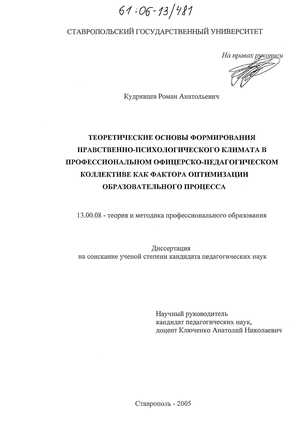 Предметом исследования является зависимость уровня профессионального мастерства преподавателей и качества образовательного процесса от состояния нравственно-психологического климата в офицерско-педагогическом коллективе высшего военного учебного заведения.