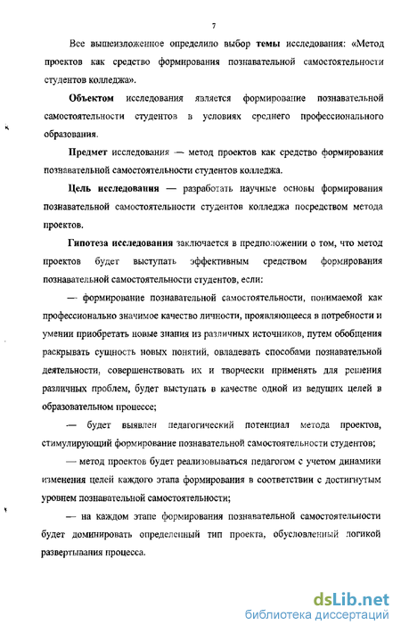 Все вышеизложенное определило выбор темы исследования; «Метод проектов как средство формирования познавательной самостоятельности студентов колледжа».