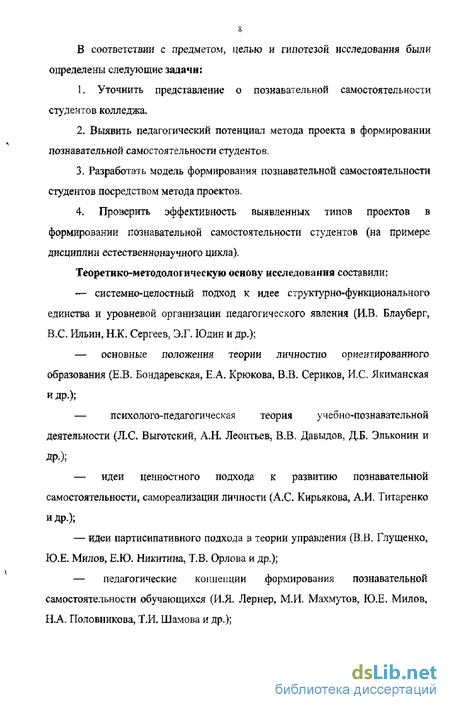 Вопросы организации учебного процесса в учреждениях среднего профессионального образования исследованы в трудах С Л Батышева , АЛ. Беляевой, МП. Горчаковой-Сибирской, ГЛС Селько, Н.Н. Михайловой; принципы функционирования системы СПО, в том числе и организации учебного процесса, определены в работах Г.В. Мухаметзяновой, ИЛ. Смирнова, Е.В. Ткаченко, A.M. Новикова и др. В этих трудах исследованы проблемы эффективности учебного процесса, в том числе обеспечения познавательной самостоятельности студентов учебных заведений среднего профессионального образования с методологических, педагогических, управленческих и других позиций. Вместе с тем авторы перечисленных и других исследований не ставили целью раскрыть комплекс педагогических условий, обеспечивающих развитие познавательной самостоятельности студентов. Вне поля их зрения остался и метод проектов как эффектианое педагогическое средство, влияющее на данный процесс.