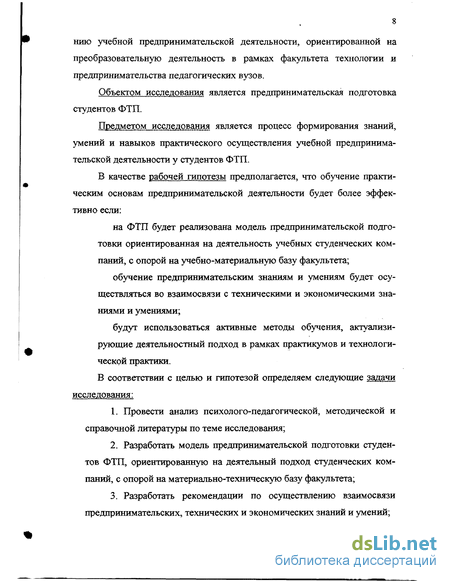 В качестве рабочей гипотезы предполагается, что обучение практическим основам предпринимательской деятельности будет более эффективно если: на ФТП будет реализована модель предпринимательской подготовки ориентированная на деятельность учебных студенческих компаний, с опорой на учебно-материальную базу факультета; обучение предпринимательским знаниям и умениям будет осуществляться во взаимосвязи с техническими и экономическими знаниями и умениями; будут использоваться активные методы обучения, актуализирующие деятельностный подход в рамках практикумов и технологической практики.