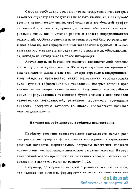 Таким образом, следует отметить, что вопросам развития по" знавательной деятельности при изучении информационных техноло" гий различных категорий обучаемых посвящено немало работ, одна" ко особенности развития познавательной деятельности студентов гуманитарного ВУЗа при изучении информационных технологий по" ка не нашли своего отражения в подобных исследованиях.