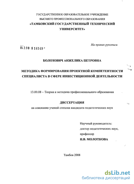 обоснована значимость и содержание проектной компетентности в структуре профессиональной компетентности специалиста в сфере инвестиционной деятельности, на формирование которой в условиях высшей школы ориентирован процесс подготовки специалистов данного профиля;