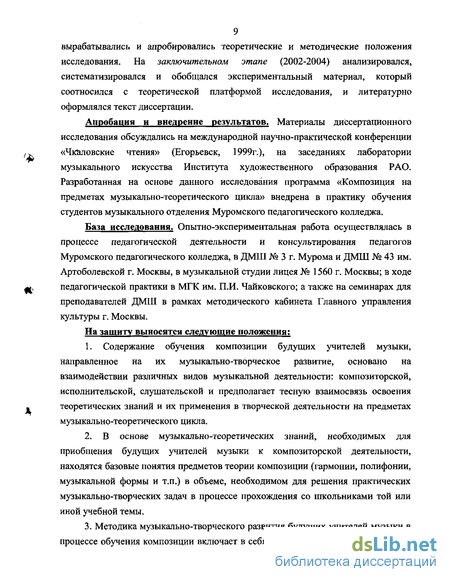 Апробация и внедрение результатов. Материалы диссертационного исследования обсуждались на международной научно-практической конференции «Чкаловские чтения» (Егорьевск, 1999г.), на заседаниях лаборатории музыкального искусства Института художественного образования РАО. Разработанная на основе данного исследования программа «Композиция на предметах музыкально-теоретического цикла» внедрена в практику обучения студентов музыкального отделения Муромского педагогического колледжа.