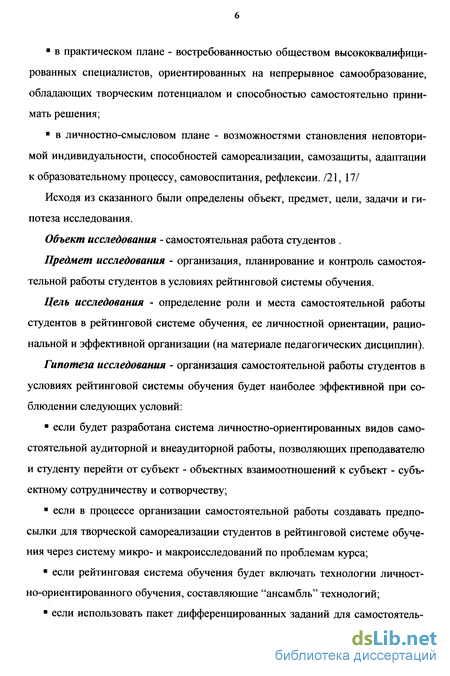 Предмет исследования - организация, планирование и контроль самостоятельной работы студентов в условиях рейтинговой системы обучения.