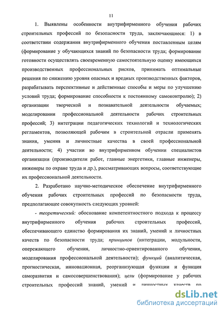 1. Выявлены особенности внутрифирменного обучения рабочих строительных профессий по безопасности труда, заключающиеся: 1) в соответствии содержания внутрифирменного обучения поставленным целям (формирование у обучающихся знаний по безопасности труда; формирование готовности осуществлять своевременную самостоятельную оценку имеющихся производственных профессиональных рисков, принимать оптимальные решения по снижению уровня опасных и вредных производственных факторов, разрабатывать перспективные и действенные способы и меры по улучшению условий труда; формирование способности к постоянному самоконтролю); 2) организации творческой и познавательной деятельности обучаемых; моделировании профессиональной деятельности рабочих строительных профессий; 3) интеграции педагогических технологий и технологических регламентов, позволяющей рабочим в строительной отрасли применять знания, умения и личностные качества в своей профессиональной деятельности; 4) участии во внутрифирменном обучении специалистов организации (производители работ, главные энергетики, главные инженеры, инженеры по охране труда и др.), рассматривающих вопросы, соответствующие их профессиональной деятельности.