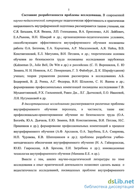 Состояние разработанности проблемы исследования. В современной научно-педагогической литературе педагогическая эффективность и практическая направленность внутрифирменной подготовки рассматривается такими учеными, как С.Я. Батышев, К.Я. Вязина, Л.П. Голощекина, В.А. Ермоленко, А.Н. Лейбович, Е.А.Рыкова, Н.Н. Шамрай и др.; организационно-педагогическим условиям, способствующим эффективности внутрифирменного обучения посвящены работы О.А. Богачева, Е.А. Корчагина, А.Р. Масалимовой, А.Я. Найна, В.В. Константиновой, Е.Л. Матухина, В.И. Петлина, и др.; теоретическим основам обучения по безопасности труда посвящены исследования зарубежных (Kahneman D., Julie Bell, De Witt и др.) и российских (С. П. Ворошилов, Е. Ю Зимина, Н. Н. Новиков, А.С. Померанцев, Г. З. Файнбург, Д. К. Шарафутдинов) ученых; теория управления рисками рассмотрена в исследованиях А.Б. Бедеровой, В. Д. Роика, А.Г. Федорца, В.Н. Шлыкова, С. Н. Яшина и др.; формированию профессиональных компетенций посвящены исследования Г.В. Мухаметзяновой, Р.Х. Гильмеевой, Равен Дж., Л.Г. Дьячковой, Е.О. Ивановой, Л.Н. Нугумановой и др.