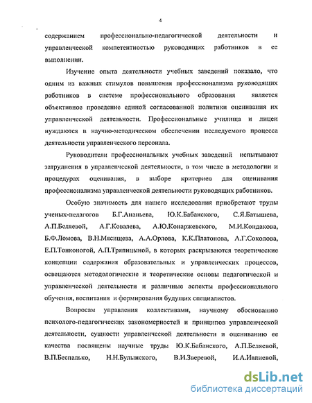 Особую значимость для нашего исследования приобретают труды ученых-педагогов Б.Г.Ананьева, Ю.К.Бабанского, С.Я.Батышева, А.П.Беляевой, А.Г.Ковалева, А.Ю.Конаржевского, М.И.Кондакова, Б.Ф.Ломова, В.Н.Мясищева, А.А.Орлова, К.К.Платонова, А.Г.Соколова, Е.П.Тонконогой, А.П.Тряпицыной, в которых раскрываются теоретические концепции содержания образовательных и управленческих процессов, освещаются методологические и теоретические основы педагогической и управленческой деятельности и различные аспекты профессионального обучения, воспитания и формирования будущих специалистов.