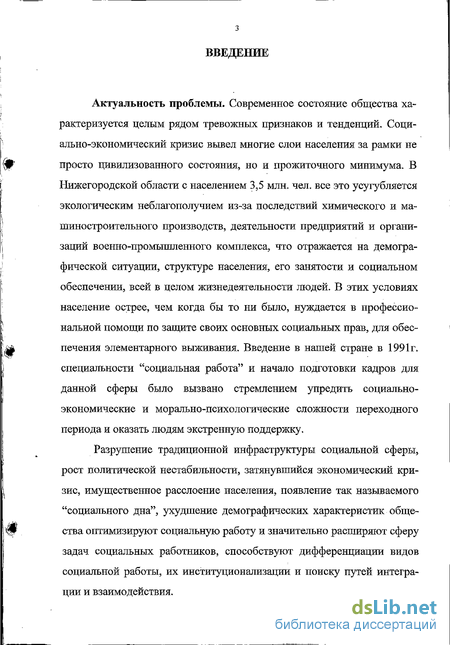 Актуальность проблемы. Современное состояние общества характеризуется целым рядом тревожных признаков и тенденций. Социально-экономический кризис вывел многие слои населения за рамки не просто цивилизованного состояния, но и прожиточного минимума. В Нижегородской области с населением 3,5 млн. чел. все это усугубляется экологическим неблагополучием из-за последствий химического и машиностроительного производств, деятельности предприятий и организаций военно-промышленного комплекса, что отражается на демографической ситуации, структуре населения, его занятости и социальном обеспечении, всей в целом жизнедеятельности людей. В этих условиях население острее, чем когда бы то ни было, нуждается в профессиональной помощи по защите своих основных социальных прав, для обеспечения элементарного выживания. Введение в нашей стране в 1991г. специальности "социальная работа" и начало подготовки кадров для данной сферы было вызвано стремлением упредить социально-экономические и морально-психологические сложности переходного периода и оказать людям экстренную поддержку.