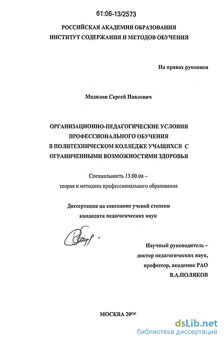 Предмет исследования. Организационно-педагогические условия профессионального обучения в политехническом колледже учащихся с ограниченными возможностями здоровья (глухие и слабослышащие).
