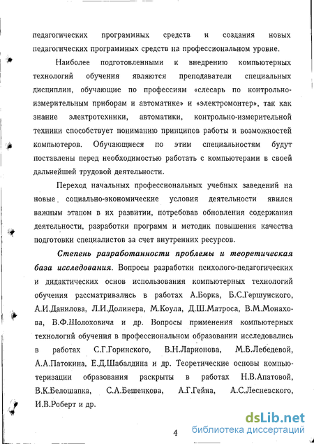 Степень разработанности проблемы и теоретическая база исследования. Вопросы разработки психолого-педагогических и дидактических основ использования компьютерных технологий обучения рассматривались в работах А.Борка, Б.С.Гершунского, А.И.Данилова, Л.И.Долинера, М.Коула, Д.Ш.Матроса, В.М.Монахова, В.Ф.Шолоховича и др. Вопросы применения компьютерных технологий обучения в профессиональном образовании исследовались в работах С.Г.Горинского, В.Н.Ларионова, М.Б.Лебедевой, А.А.Патокина, Е.Д.Шабалдина и др. Теоретические основы компьютеризации образования раскрыты в работах Н.В.Апатовой, В.К.Белошапка, С.А.Бешенкова, А.Г.Гейна, А.С.Лесневского, И.В.Роберт и др.