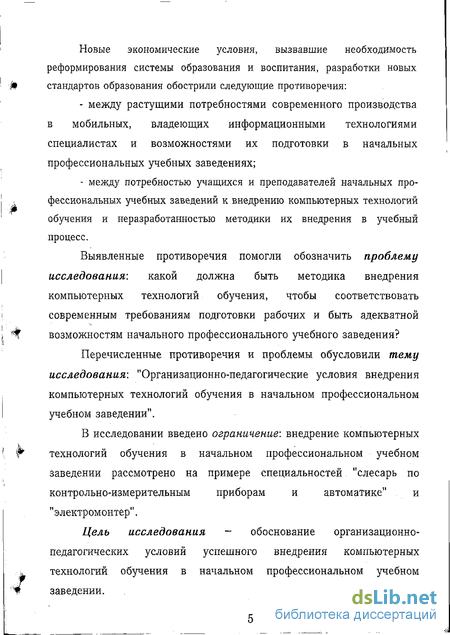 Перечисленные противоречия и проблемы обусловили тему исследования: "Организационно-педагогические условия внедрения компьютерных технологий обучения в начальном профессиональном учебном заведении".
