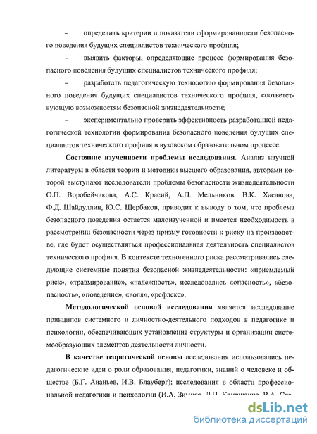 Состояние изученности проблемы исследования. Анализ научной литературы в области теории и методики высшего образования, авторами которой выступают исследователи проблемы безопасности жизнедеятельности О.П. Воробейчикова, А.С. Красий, А.П. Мельников. В.К. Хасанова, Ф.Д. Шайдуллин, Ю.С. Щербаков, приводит к выводу о том, что проблема безопасного поведения остается малоизученной и имеется необходимость в рассмотрении безопасности через призму готовности к риску на производстве, где будет осуществляться профессиональная деятельность специалистов технического профиля. В контексте техногенного риска рассматривались следующие системные понятия безопасной жизнедеятельности: «приемлемый риск», «травмирование», «надежность», исследовались «опасность», «безопасность», «поведение», «воля», «рефлекс».