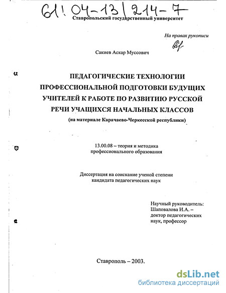 7 С учетом недостаточной теоретической разработки проблемы и ее значимости определена тема диссертационного исследования - «Педагогические технологии профессиональной подготовки будущих учителей к работе по развитию русской речи учащихся начальных классов (на материале Карачаево-Черкесской республики)».