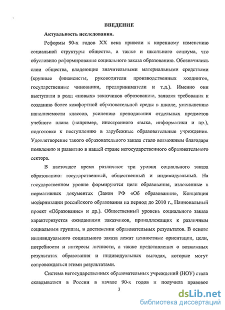 Актуальность исследования. Реформы 90-х годов XX века привели к коренному изменению социальной структуры общества. Обозначились слои общества, владеющие значительными материальными средствами (крупные финансисты, руководители производственных холдингов, государственные чиновники, предприниматели и пр.). Именно они выступили в роли «новых» заказчиков образованию, заявляя требования к созданию более комфортной образовательной среды в школе, уменьшению наполняемости классов, усилению преподавания отдельных предметов учебного плана (например, иностранного языка, информатики и пр.), подготовке к поступлению в зарубежные ВУЗы. Удовлетворение такого образовательного заказа стало возможным, благодаря инновационным процессам в образовании, в том числе, появлению и развитию в нашей стране негосударственного образовательного сектора.
