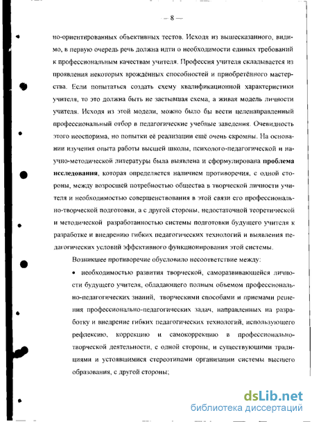 Неумение проводить исследовательскую работу, сравнивать результаты педагогического эксперимента, анализировать и правильно оценивать их приводит к тому, что достаточно большое количество учителей, получая низкий результат в обучении школьников, винят самого школьника (низкий уровень способностей, нет желания учиться, нет помощи со стороны родителей и т.д.) или дидактическую систему (нелогично составлена программа, не предусмотрено формирование вычислительных или орфографических навыков там, где это было предусмотрено в традиционной системе, очень высокий уровень сложности, мешает «слоёный пирог» в подаче материала, нет подробных методических разработок уроков и т.д.). Эти выводы — результат того, что у большинства учителей отсутствует желание ПОСТОЯННО изучать педагогическую науку, и именно это не позволяет понять им, что технологии обучения на основе традиционной дидактической системы пригодны лишь для создания общей ориентировки учащихся в предмете, а не для прочного овладения предметом. А также, пытаясь интегрировать технологии, учитель должен: 1 — по всем учебным предметам поставить диагностические цели и на их основе выработать стандарт подготовки учащихся; 2 — осуществлять строгий контроль за осуществлением этого стандарта на основе критериаль- но-ориентированных объективных тестов. Исходя из вышесказанного, видимо, в первую очередь речь должна идти о необходимости единых требований к профессиональным качествам учителя. Профессия учителя складывается из проявления некоторых врождённых способностей и приобретённого мастерства. Если попытаться создать схему квалификационной характеристики учителя, то это должна быть не застывшая схема, а живая модель личности учителя. Исходя из этой модели, можно было бы вести целенаправленный профессиональный отбор в педагогические учебные заведения. Очевидность этого неоспорима, но попытки её реализации ещё очень скромны. На основании изучения опыта работы высшей школы, психолого-педагогической и научно-методической литературы была выявлена и сформулирована проблема исследования, которая определяется наличием противоречия, с одной стороны, между возросшей потребностью общества в творческой личности учителя и необходимостью совершенствования в этой связи его профессионально-творческой подготовки, а с другой стороны, недостаточной теоретической и методической разработанностью системы подготовки будущего учителя к разработке и внедрению гибких педагогических технологий и выявления педагогических условий эффективного функционирования этой системы. Возникшее противоречие обусловило несоответствие между; необходимостью развития творческой, саморазвивающейся личности будущего учителя, обладающего полным объемом профессионально-педагогических знаний, творческими способами и приемами решения профессионально-педагогических задач, направленных на разработку и внедрение гибких педагогических технологий, использующего рефлексию, коррекцию и самокоррекцию в профессионально-творческой деятельности, с одной стороны, и существующими традициями и устоявшимися стереотипами организации системы высшего образования, с другой стороны; увеличивающимся потоком информации о появлении альтернативных систем, программ и курсов обучения школьников и недо