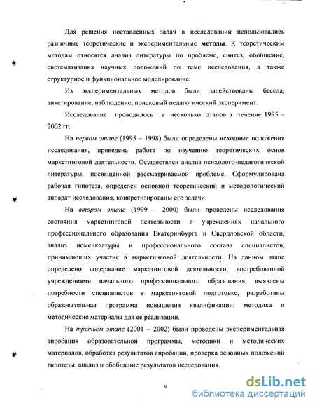 На первом этапе (1995 - 1998) были определены исходные положения исследования, проведена работа по изучению теоретических основ маркетинговой деятельности. Осуществлен анализ психолого-педагогической литературы, посвященной рассматриваемой проблеме. Сформулирована рабочая гипотеза, определен основной теоретический и методологический аппарат исследования, конкретизированы его задачи.