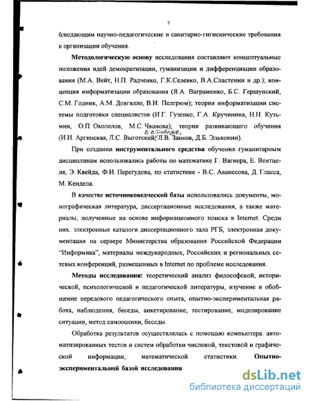 Методологическую основу исследования составляют концептуальные положения идей демократизации, гуманизации и дифференциации образования (М.А. Вейт, Н.П. Радченко, Г.К.Селевко, В.А.Сластенин и др.); концепция информатизации образования (Я.А. Ваграменко, Б.С. Гершунский, СМ. Годник, A.M. Довгялло, В.И. Пелгрюм); теория информатизации системы подготовки специалистов (ИГ. Гузенко, ГА. Кручинина, Н.Н. Кузьмин, О.П. Околелов, М.С. Чванова); теория развивающего обучения (ИИ. Аргинская, Л.С. Выготский Л.В. Занков, Д.Б. Эльконин).