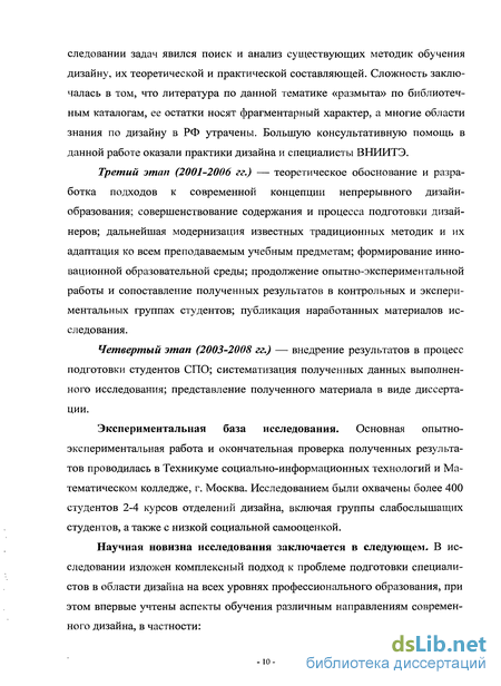 Этапы исследования. Исследование проводилось с 1993 по 2008 г.г. и состояло из нескольких этапов. Адаптация и использование существующих отечественных методик подготовки дизайнеров, разработанных на базе Всероссийского научно-исследовательского института технической эстетики (ВНИИТЭ), позволили проводить ряд этапов параллельно.