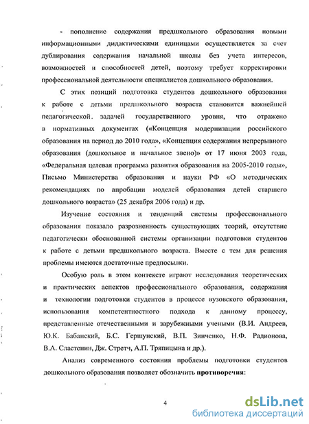 - между потребностью предшкольного образования как образования детей старшего дошкольного возраста в компетентных кадрах и недостаточной научно обоснованной системой профессиональной подготовки студентов