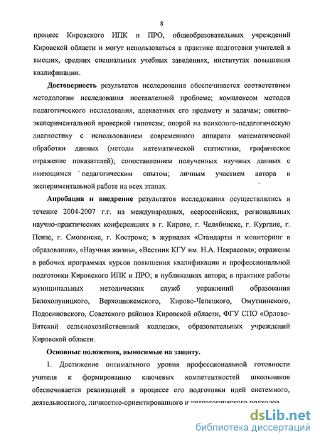1. Достижение оптимального уровня профессиональной готовности учителя к формированию ключевых компетентностей школьников обеспечивается реализацией в процессе его подготовки идей системного, деятельностного, личностно-ориентированного и андрагогического подходов.