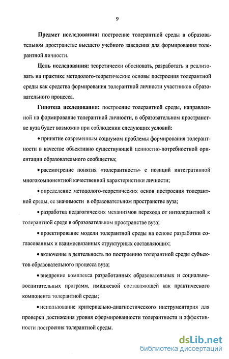 Гипотеза исследования: построение толерантной среды, направленной на формирование толерантной личности, в образовательном пространстве вуза будет возможно при соблюдении следующих условий: