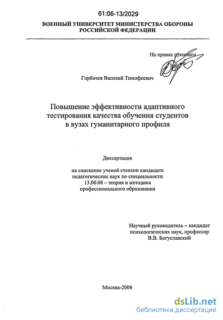 Анализ современного состояния научной разработки проблемы адаптивного тестирования показывает, что, несмотря на имеющиеся исследования в этой области, в прямой постановке проблема повышения эффективности адаптивного тестирования качества обучения студентов в вузах гуманитарного профиля не рассматривалась. Актуальность проблемы, теоретическая и практическая значимость, а также недостаточная научная разработка и обоснование педагогических путей повышения эффективности адаптивного тестирования качества обучения студентов в вузах гуманитарного профиля обусловили выбор темы диссертационного исследования.