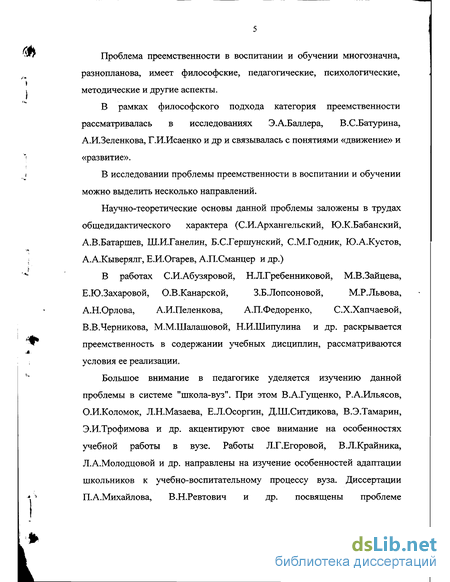 Большое внимание в педагогике уделяется изучению данной проблемы в системе "школа-вуз". При этом В.А.Гущенко, Р.А.Ильясов, О.И.Коломок, Л.Н.Мазаева, Е.Л.Осоргин, Д.Ш.Ситдикова, В.Э.Тамарин, Э.И.Трофимова и др. акцентируют свое внимание на особенностях учебной работы в вузе. Работы Л.Г.Егоровой, В.Л.Крайника, Л.А.Молодцовой и др. направлены на изучение особенностей адаптации школьников к учебно-воспитательному процессу вуа. Диссертации П.А.Михайлова, В.Н.Ревтович и др. посвящены проблеме преемственности с целью повышения эффективности обучения на подготовительном отделении вуза.