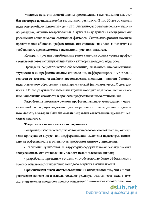 Научная новизна исследования. Впервые в качестве предмета научного исследования выбраны молодые педагоги высшей школы, рассмотрен процесс их профессионального становления.